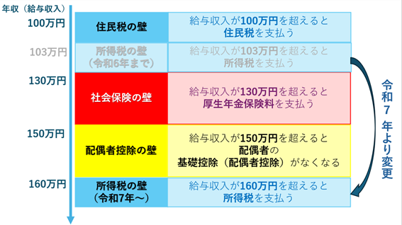そもそも、壁と呼ばれるものは税金(住民税・所得税)、社会保険、配偶者の配偶者控除の4種類があります。