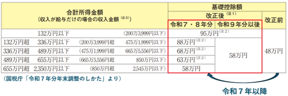 これまで、基礎控除は所得に関わらず一律48万円でした。しかし、令和7年分以降は、