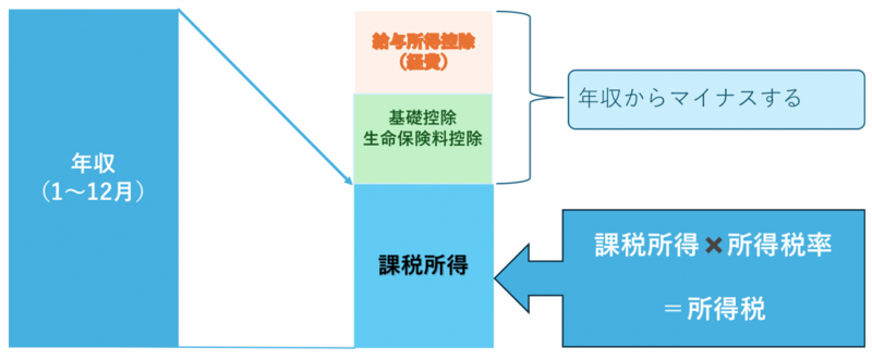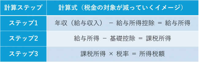 ↑所得税の計算は、収入から段階的に控除を引いていくイメージです