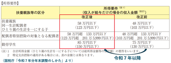 扶養親族(扶養に入れる家族)の所得上限が緩和され、10万円引き上げられる方向です。